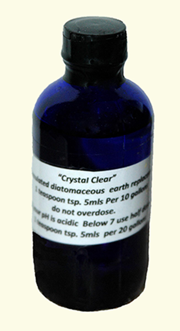 "Crystal Clear" a formulated diatomaceous earth replacement, is a clear solution and will remove particles down to 1 micron and less, not only polishing your water also removing free floating parasites, bacteria and algae as well! All you add to the aquarium is 1 teaspoon (5mls) per 10 gallons and you will begin to notice the migration of the color through the depth of the media. The media which is 100% polyster fiber used to stuff pillows starts out as snowy white then increasingly darkens. It takes about a minute to change out the media. The used media can be discarded as it is very inexpensive and can be purchased at most stores (Walmart, Joanne Fabrics, etc.)