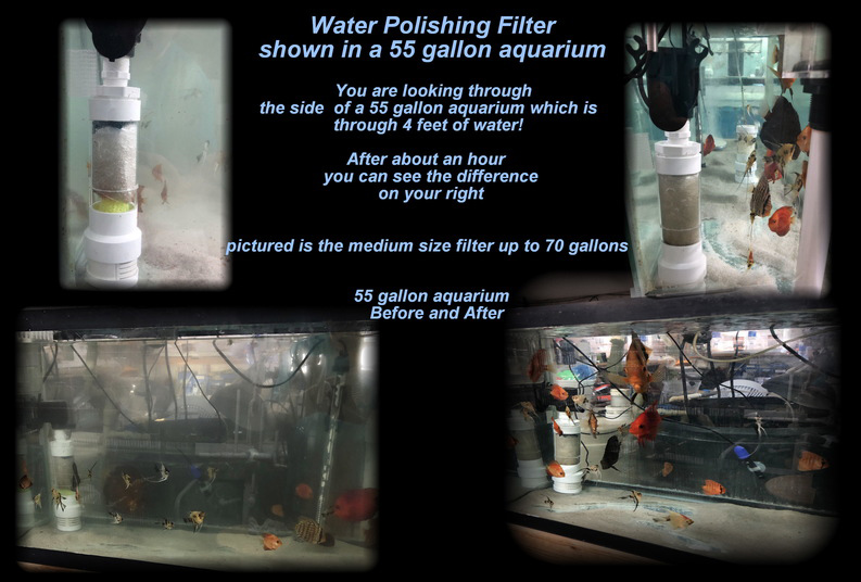 The polishing system works as a depth filter, uses negative suction and comes in 3 different sizes. The difference is most filters push the water and particulate through the media. In negative suction the water is pulled through the filter media allowing for more even flow and it prevents the media from collapsing on itself. The System will remove particulates down to 50 microns, when using “Crystal Clear” ( my formulated diatomaceous earth replacement) you will be able to remove particulates down to 1 micron not only polishing your water but removing free floating parasites as well! All you add to the aquarium is 1 teaspoon (5 mls) per 10 gallons and you will be able to notice the migration of the color through the depth of the media. The media which is 100% polyester fiber used to stuff pillows starts out as snowy white then increasingly darkens. It takes about a minute to change out the media. The used media can be discarded as it is very inexpensive and can be purchase at most stores.